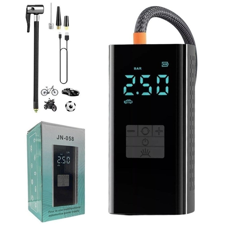 Bomba de aire eléctrica portátil, ideal para inflar neumáticos de coche, bicicleta, moto y otros vehículos. Incluye funciones adicionales de batería externa y linterna.